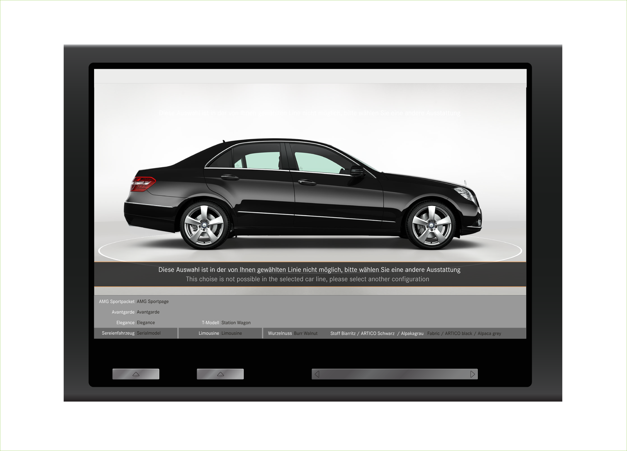 Während 2006 der Wechsel zwischen Ex- und Interieur noch mit zwei unabhängig von einander agierenden Interfaces realisiert werden musste, konnte man 2009 bereits beide Ansichten auf einem Interface darstellen. Durch eine manuelle Schiebebewegung des 30" Bildschirms, mit einer Auflösung von 2560x1600 Pixel, konnte man nahtlos zwischen der Innen- und Aussenansicht der E-Klasse wechseln.