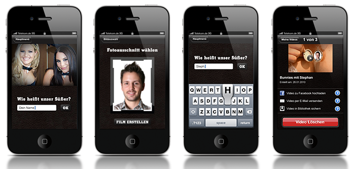 Das konfigurierbare Video ist das gleiche, das bereits im Web sehr erfolgreich läuft. Dazu schießt der User ein Foto von sich bzw. lädt es hoch und gibt seinen Namen in die App ein. Durch unsere Individualsierungstechnik wird nun dem User ermöglicht, Teil des Videos zu werden. Er taucht dann in der Designer-Wohnung eines echten Playboy-Bunnys als Bild an der Wand oder in einem Amulett auf bzw. ziert der eigene Name als Tattoo die Haut der Playmates.