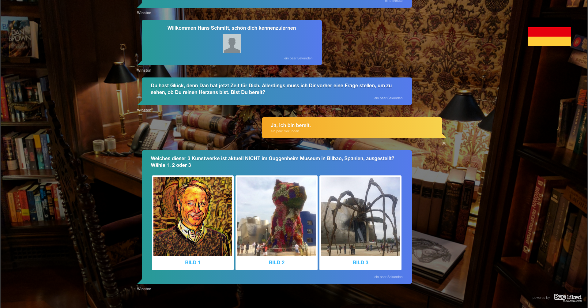 Nach einer kurzen Begrüßung soll man sich mit Hilfe von Facebook anmelden damit Winston die Identität des Users überprüfen kann. Danach stellt er einem eine Frage zum Thema Kunstwerke, die man entsprechend richtig beantworten muss um weiter im Dialog zu kommen.
