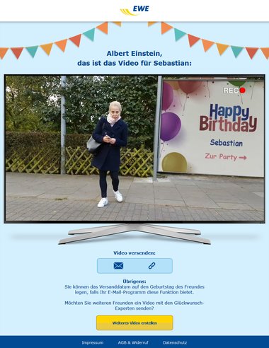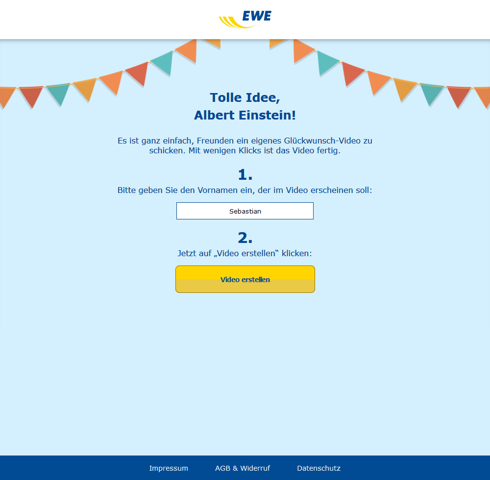 Ziel des Projekts war es, eine Plattform zu schaffen, über die es möglich ist, datenbankgetriebe Geburtstagsgrußvideos für die EWE Kundschaft zu erstellen und jene automatisiert an diese per Grußmail inkl. eingebettetem Link zum Videoclip auszuliefern. Der Mailversand erfolgte dann über die Agentur „Rabbit“ ebenso automatisiert an dem Geburtstag des Kunden.