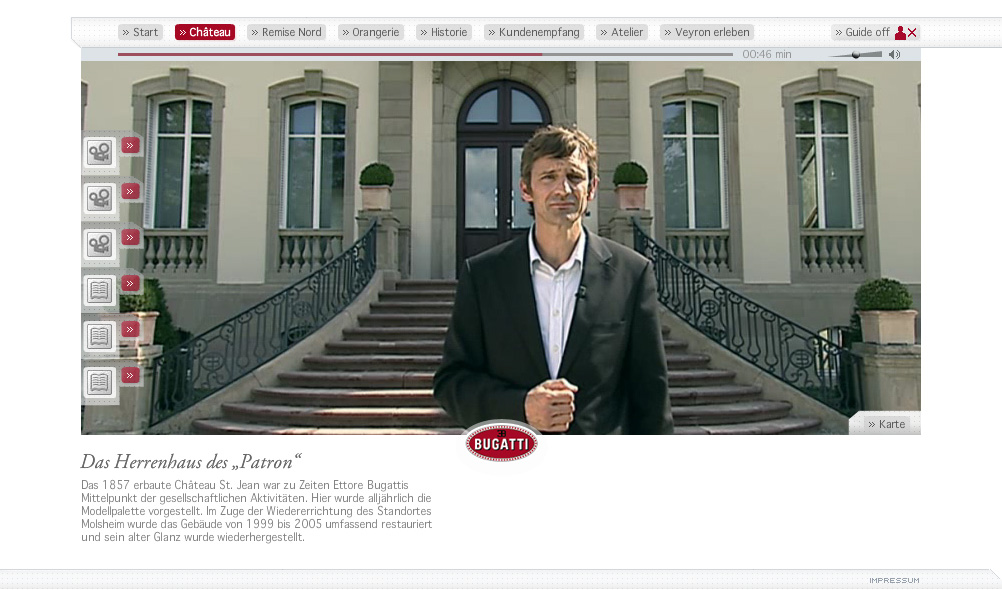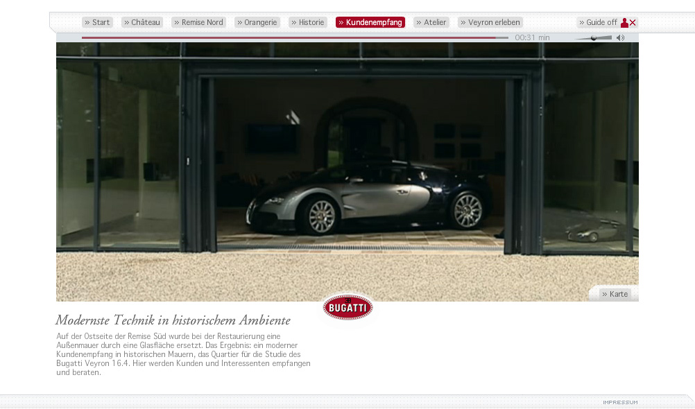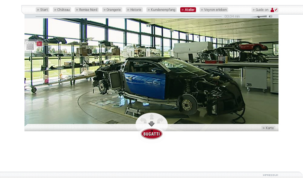 Der virtuelle Rundgang zeigt den Besuchern durch neue, von DDD produzierte Filme weitestgehend das gleiche exklusive Ambiente wie in der Realität. Dabei wird sowohl ein Blick von außen, als auch in die einzelnen Gebäude gewährt. Zudem sieht der User zeitgenössische Fotografien und bekommt detaillierte Hintergrundinformationen zur Geschichte der Marke und Fabrikation des Bugatti Veyron in den Sprachen Deutsch, Englisch und Französisch – auf Wunsch gibt es eine Guided-Tour.