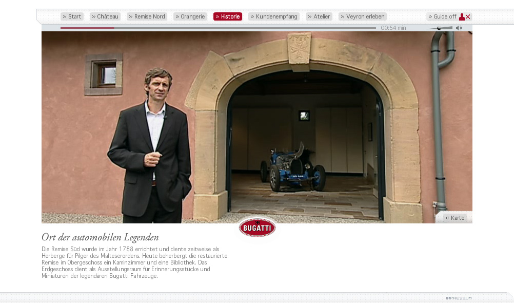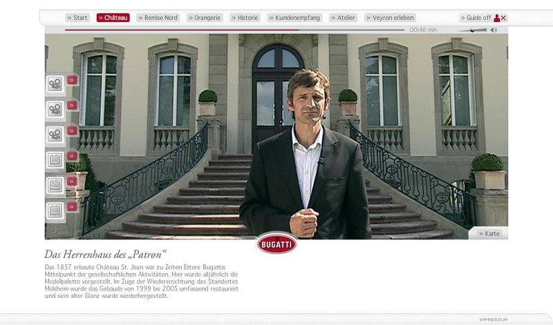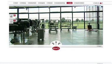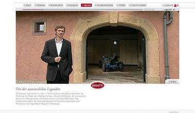 Vorstellung der Produktionsstätte und des historischen Geländes der Automobilmarke Bugatti durch eine virtuelle Tour. Das Anwesen im französischen Elsass, dessen reale Besichtigung bislang wenigen Gästen vorbehalten ist, soll jetzt auch virtuellen Besuchern einen Einblick in die Historie sowie in die hochmoderne Manufaktur ermöglichen.