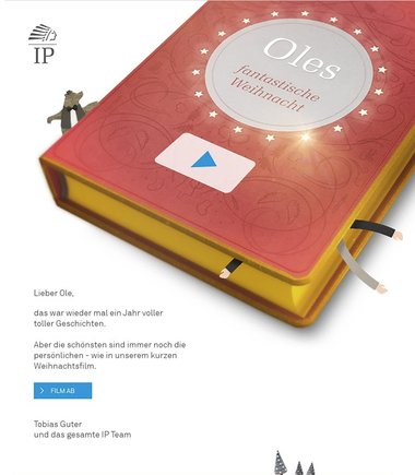 IP Deutschland für den diesjährigen Weihnachtsgruß so erweitert, dass der Versender bestimmen konnte, zu welchem Datum genau seine Nachricht und der Gruß versendet werden sollen. So hatten die Mitarbeiter der IP Deutschland die Möglichkeit, schon ab Anfang Dezember ihre persönlichen Wünsche zu erstellen. Der Versand fand dann erst zwischen dem 08.12. bis zum 16.12. statt.
