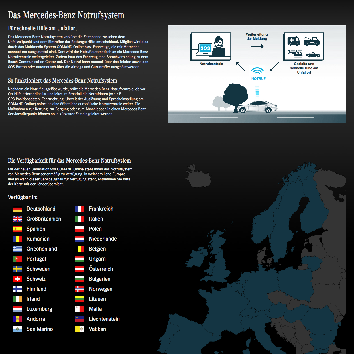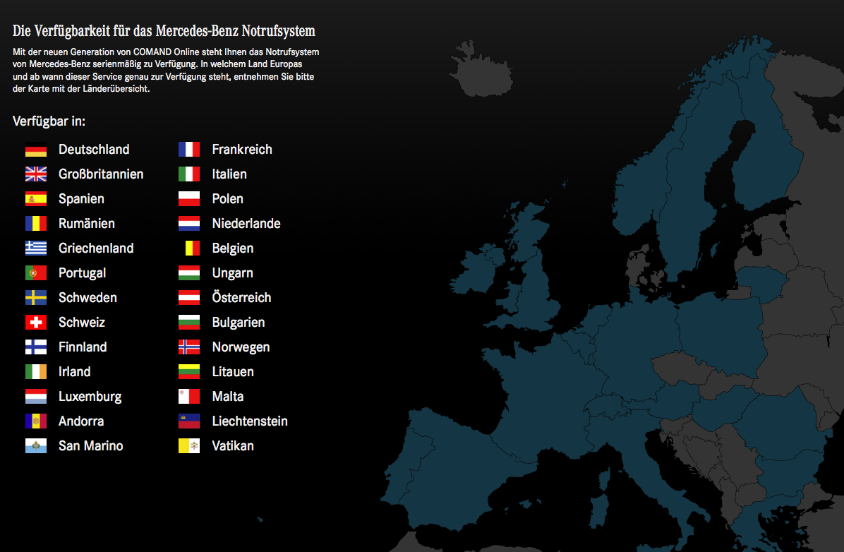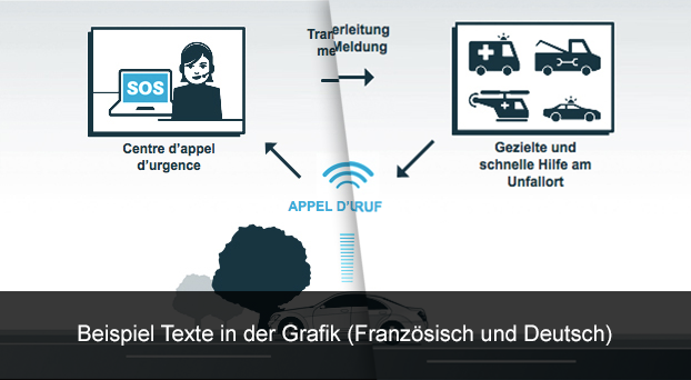 Eines unserer Mercedes-Benz Projekte brauchte ein größeres Sprachupdate, mit Optimierungen der bereits von uns angefertigten Grafiken. Hierbei drehte es sich um das, erstmals 2012 veröffentlichte eCall-System von Mercedes Benz, welches für Kunden gedacht ist, die mit ihrem Auto liegen bleiben. Nachdem ein Notruf ausgelöst wurde, prüft die Mercedes-Benz Notrufzentrale, ob vor Ort Hilfe erforderlich ist und leitet im Ernstfall die Notrufdaten (wie z.B. GPS-Positionsdaten, Fahrtrichtung, Uhrzeit der Auslösung und Spracheinstellung am COMAND Online) sofort an eine öffentliche europäische Notrufzentrale weiter. Unsere Aufgabe in diesem Fall war es, weitere Sprachen einzupflegen und die Grafiken zu internationalisieren.