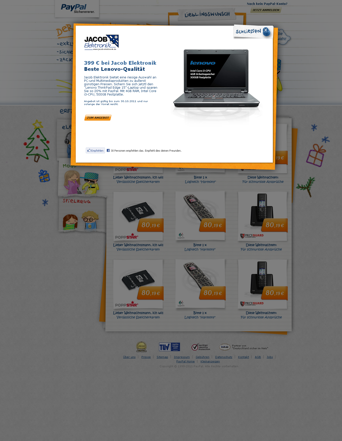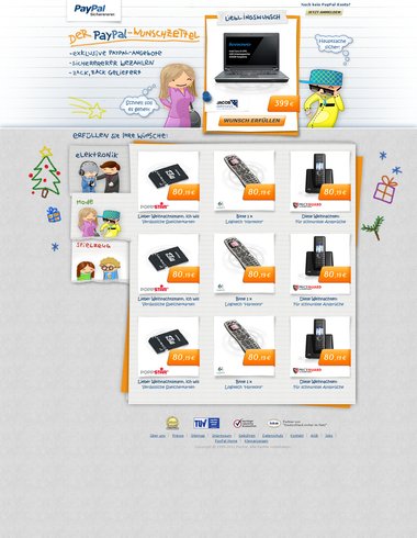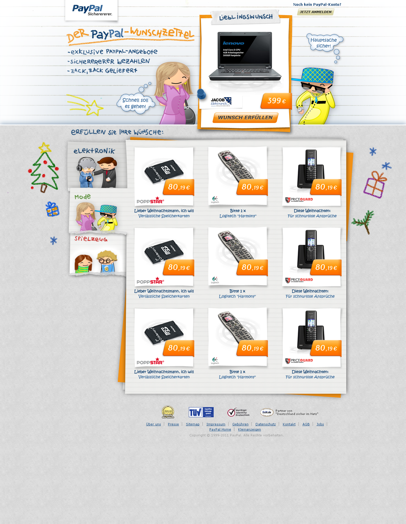 DDD realisiert einen eCommerce-Shop, in dem PayPal-Kunden als Dankeschön für ihr Vertrauen Produkte aus Partnershops zu vergünstigten Preisen kaufen können. Dieser eCommerce-Shop ist Teil einer umfassenden Xmas-Kampagne und kann über die Landingpage „PayPal-Wunschzettel“ erreicht werden. DDD ist bei der Version zu Weihnachten 2011 für die gesamte Programmierung verantwortlich.