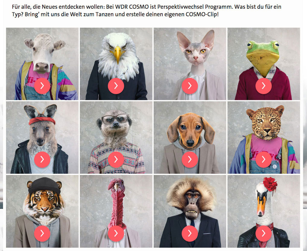 Der Radiosender „COSMO“, der vom WDR, Radio Bremen und rbb gemeinsam produziert wird, möchte sein Markenimage mit dynamischen COSMO-Clips kommunizieren und so auf sich aufmerksam machen. Der User soll die Möglichkeit haben einen tierischen Charakter auszuwählen, diesen mit Namen und wahlweise mit oder ohne Foto zu personalisieren. Vier kurze Audioclips sollten zur Auswahl stehen, um den eigenen WDR COSMO-Clip mit der passenden Musik zu unterlegen. Anschließend soll der User sein Video ansehen, herunterladen, teilen und verschicken können.