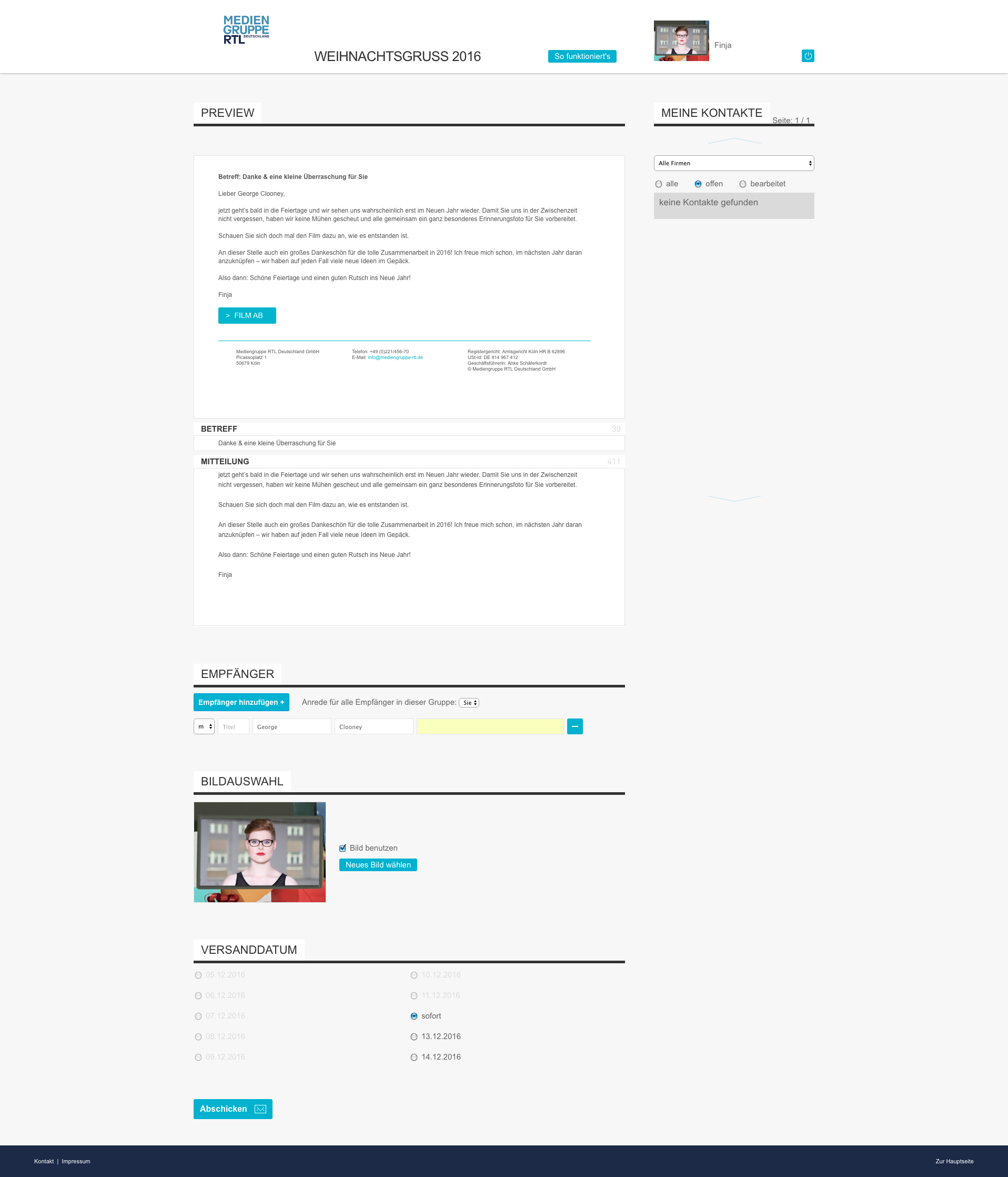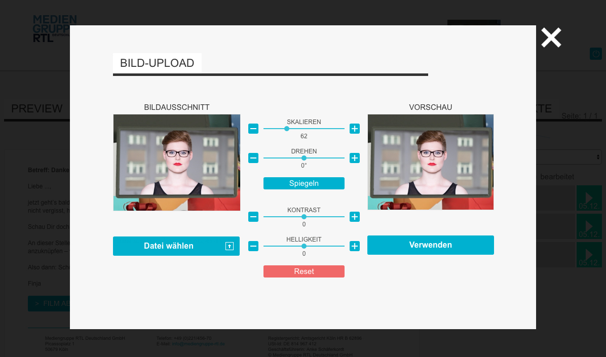 The new film concept contains significantly less personalization this year. For the first time, however, this includes the image and/or sender's name in a monitor and the recipient's name on a festively decorated banner. In order to integrate the sender's image into the video, the input tool in the backend has been modified so that the user's image section matches the new film. By using the sliders, the picture could be adapted to the user's wishes and the monitor that was later to be found in the video.