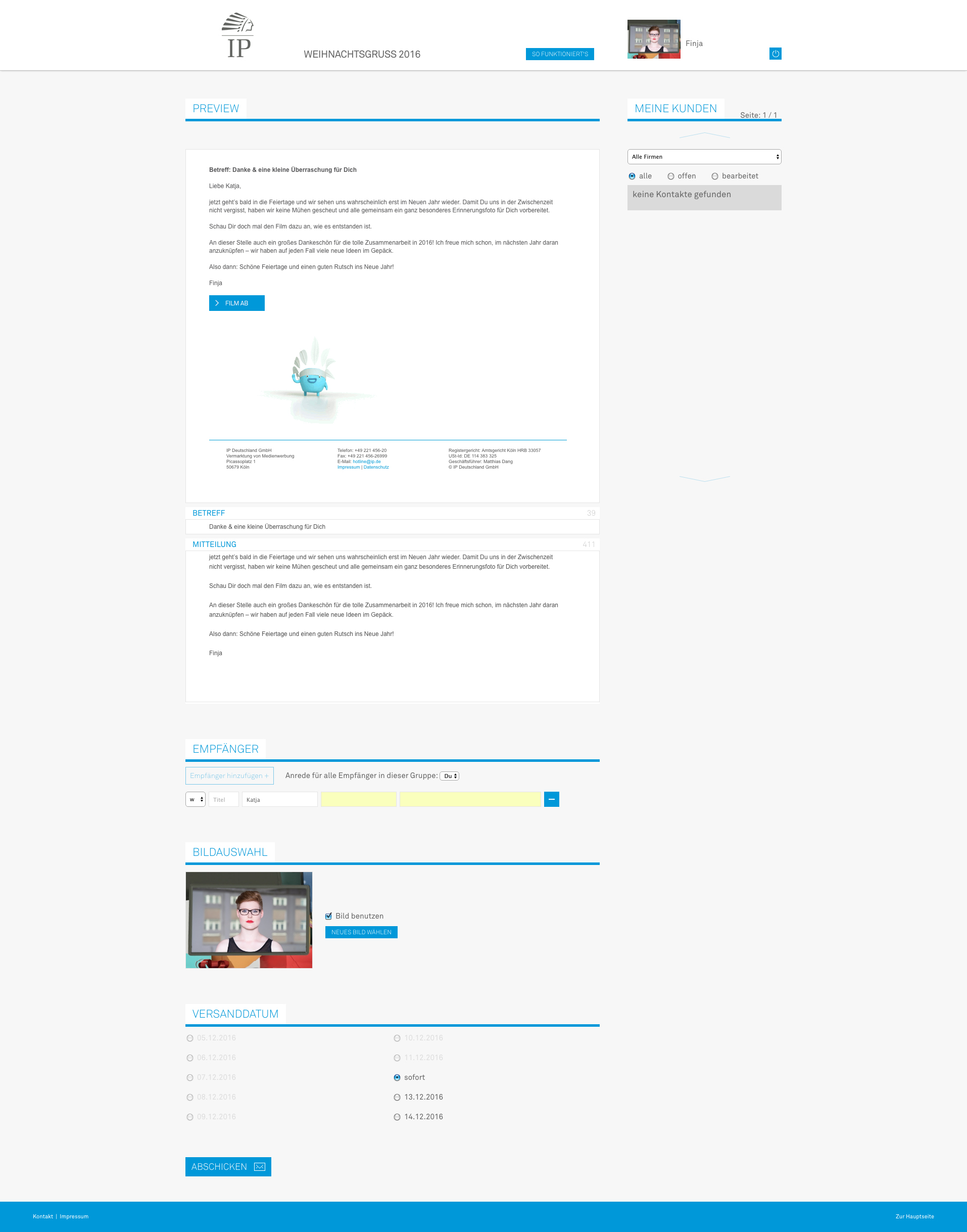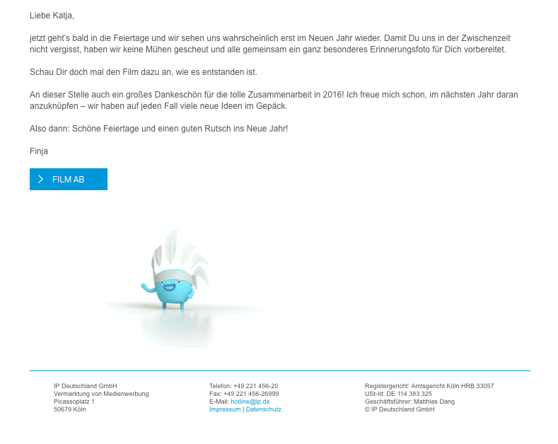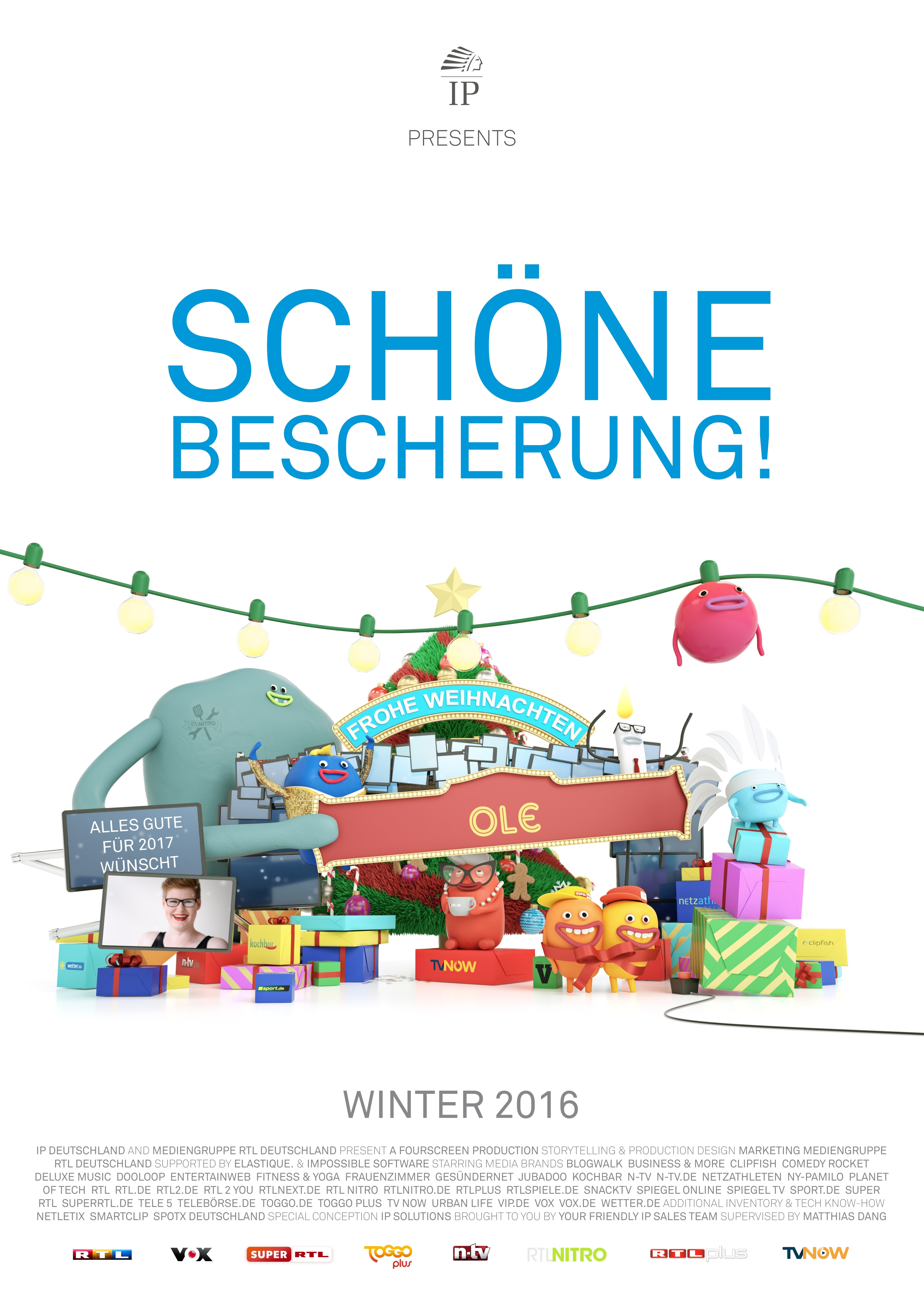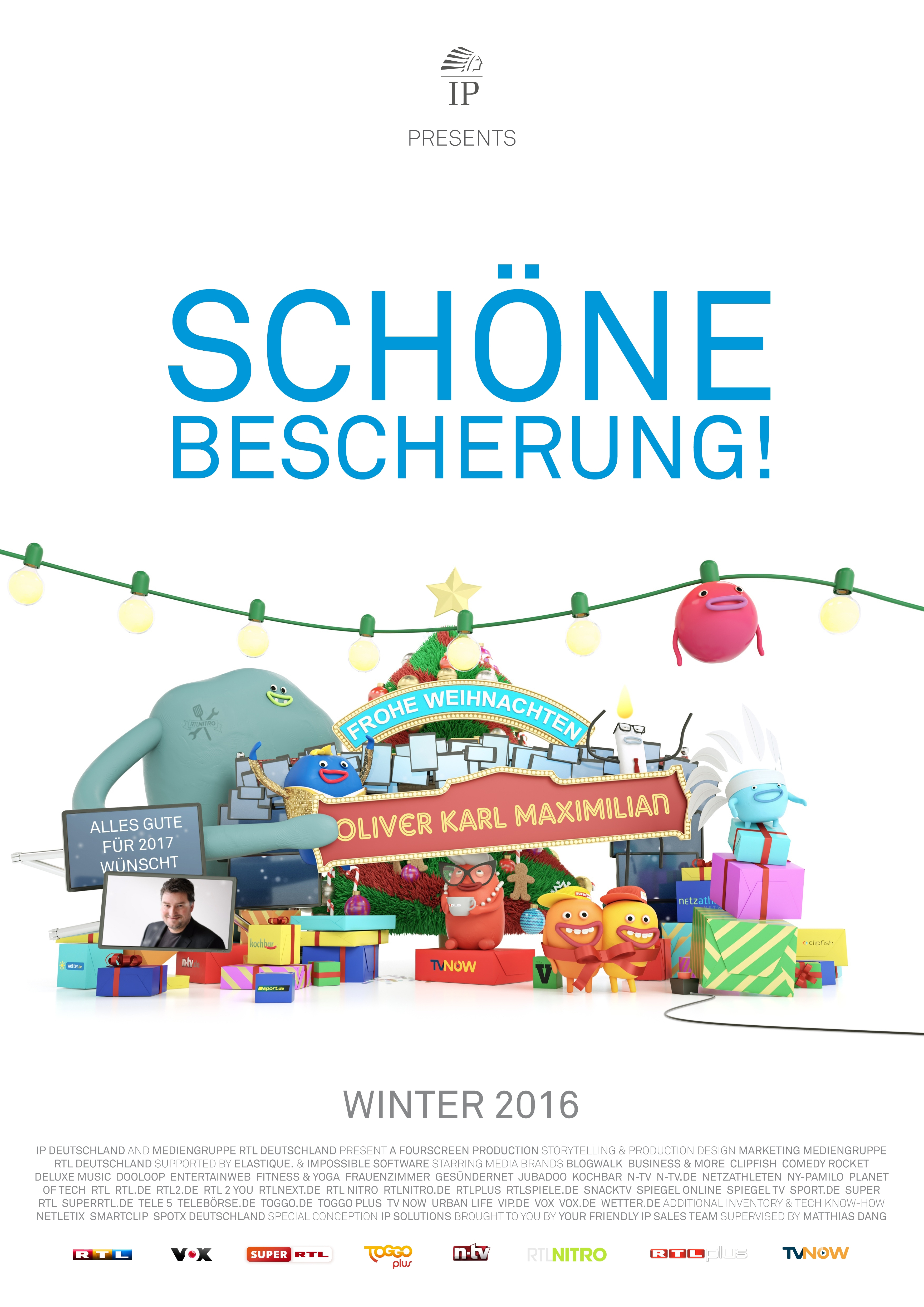 At the end of last year we were working on a project for IP Deutschland GmbH, as in previous years. Since 2013, it has almost become a tradition for RTL Groups advertising marketing company to produce Christmas video greetings. In 2016, this shouldn’t be any different and for the first time, Mediengruppe RTL joined in with the broadcasters RTL, VOX, Super RTL, N-TV and RTL NITRO. Personalized greetings should also be sent to customers in 2016 to thank them personally for a great year and wish them all the best for 2017. As in previous years, the videos were to be sent on behalf of the respective employees to the corresponding customers. After receiving an email with the link to the video, the customer can watch the video this year, download a poster and create their own videos and send them to friends for the first time. At the request of IP, this function was technically limited to the group of direct customers only. The difference between the IP and Mediengruppe version lies on one hand in a customized backend system for creating personalized mails and videos, the correspondingly different branding, personalized mail and the video branded especially for the Mediengruppe RTL, in which a specially created character with a smart cylinder plays the main role. In the IP version it is a small native American, based on the logo of IP Deutschland. In addition, some features such as the poster and the redirection function are only limited to the film of IP Deutschland.