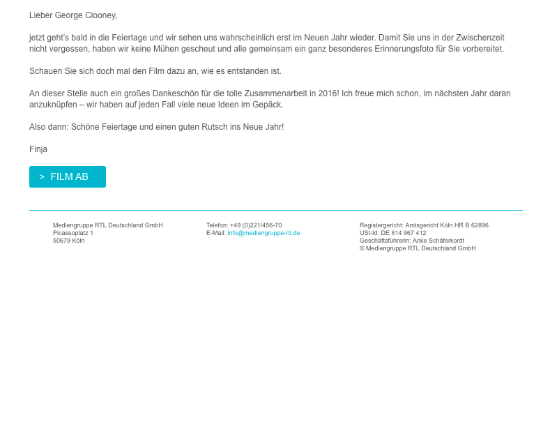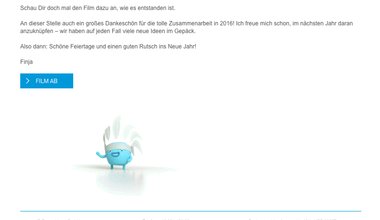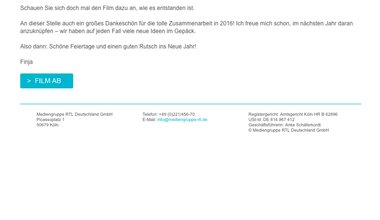 The text for the invitation mail to the customer was implemented this year with two input boxes for subject and text. At the same time, the user could also specify a personal salutation for either a personal or respective form and customize the gender of the recipient. The resulting text proposals were immediately displayed to the user in the backend tool. In the preview of the mail at IP Deutschland there is a small IP native American as a gif included, who points excitedly to the button to the film. This gif has been omitted from the mail of the media group RTL.