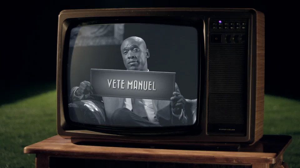 Within the video there are different text individualizations. On a daily newspaper that Clarence Seedorf holds in his hand, on a table card with reflections in the surface of the table, on a metal signboard that is engraved with the text and on which the industry is also written, on a large cardboard signboard that Mr. Seedorf presents in an B/W TV set and a huge text that had to be covered with various glow effects.