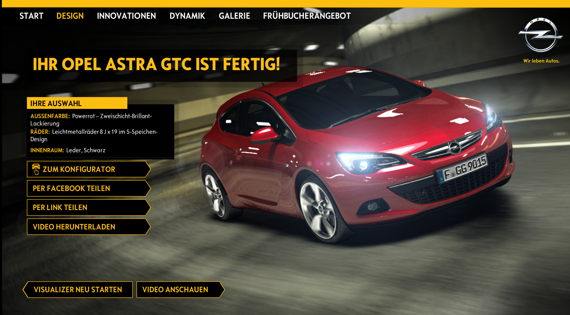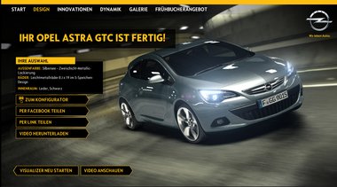 For the product introduction of the new Opel Astra GTC, a configurator is to be produced, offering the possibility to configure the vehicle live, inside a running presentation video. This way, the user can configure his or her dream car virtually and even see it in action before the car is even sold.